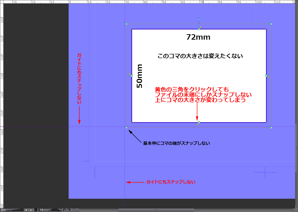 > 現状、初めに長方形コマツールで描画する際は基本枠にスナップ可能ですが