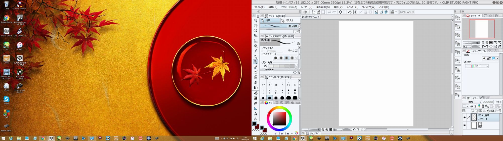 こんにちは お世話になっております。一か月半ほど前にワコム製品の液晶タブレット13HDを購入したのですが(型番はDTK-1301) clipstudio(試供品=以前、インティオスのペンタブを買った時についてきた2年間無料ライセンスを使用しています) を開いた際 パソコンに表示されたものをそのまま液タブに移動させたところ なんだか表示がとても変なことになってしまいました…。 こんな感じです。(分かりやすくメインディスプレイとつなげて横長の画像にしています↓) ![]() 全体的に拡大表示されてしまっていて キャンバスを開いてみると なんだかモヤっとした感じになってしまいます キャンバスのスペースも狭く これでは絵が描けないなと思いました。 ペンのずれとかは今のところ大丈夫なのですが…。 パソコンでの表示はこうです↓ ![]() 違いがわかると思います。 液タブもパソコンの解像度もクリスタも 特に何もいじった記憶がありません。 個人的にも色々と調べてみたのですが 「高DPI 設定では画面のスケーリングを無効にする」にチェックを入れたら 液タブでも広く表示するようになったので 「あ、直ったんだ」って思ったのですが 描いた絵の画質(?)と言うか色や線が クリスタを液タブからパソコンへ戻して再度絵を見ると なんだか汚く(画が荒く)見えるのです。 もしかしたら気のせいかもしれないのですが どうしても気になってしまいます。 この高DPI~ と言うのにチェックを入れずに パソコンの表示状態のまま液タブに表示することは不可能なのでしょうか? 変換アダプタに繋げて液タブを使用しているのですが そのせいもあるんでしょうか? ちなみに使っている変換アダプタはこちらです↓ 液晶タブレット13HD 型番=DTK-1301 clipstudio pro バージョン: 1.5.5 パソコンOS Windows8.1 NEC VALUESTAR 型番=PC-VN770SSR ------------------------------------------------------------ ■バージョン:1.5.5 ※Windowsは、[ヘルプ]メニュー → [バージョン情報]で確認できます。 ※MacOSXは、[CLIP STUDIO PAINT]メニュー → [バージョン情報]で確認できます。 ■グレード DEBUT( ) comico( ) PRO( ○ ) EX( ) ■OS Windows XP( ) Windows Vista( ) Windows 7 ( ) Windows 8( ) Windows 8.1( ○ ) Windows 10( ) MacOS X 10.5( ) MacOS X 10.6( ) MacOS X 10.7( ) MacOS X 10.8( ) MacOS X 10.9( ) MacOS X 10.10( ) MacOS X 10.11( ) その他( ) ------------------------------------------------------------ NEC VALUESTAR 型番=PC-VN770SSR |