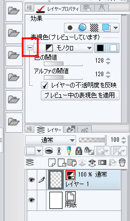2.[レイヤープロパティ]パレットにて[表現色]を[モノクロ]に変更