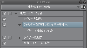 調べてもわからなかったので質問させていただきます。 「フォルダーを作成してレイヤーを挿入」をオートアクションに組み込むと、「レイヤーを複製:いいえ」と記載されます。 ![]() これは「レイヤーを複製:はい」もあるのでしょうか? もしかして、選択したレイヤーを複製してフォルダにまとめてくれる機能がクリスタにはありますか? ご回答・ご教授よろしくお願いします。 |