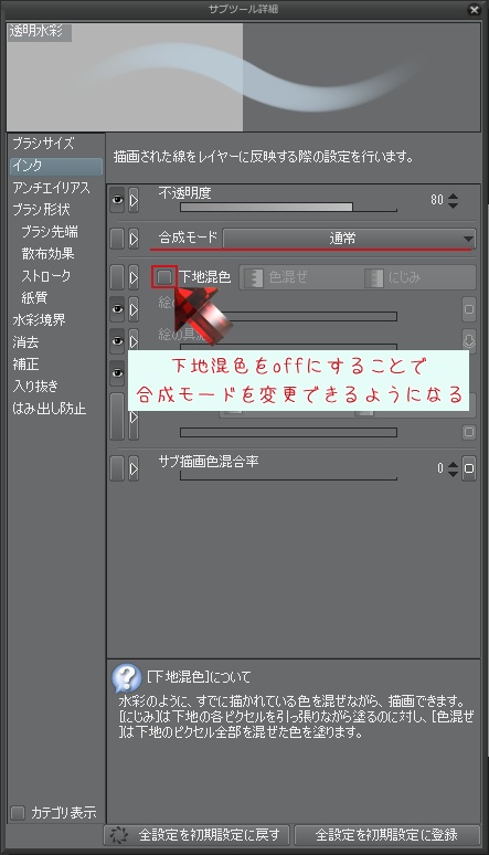 とのことですが、「サブツール詳細」ダイアログ「インク」カテの「下地混色」がonになっていませんか?