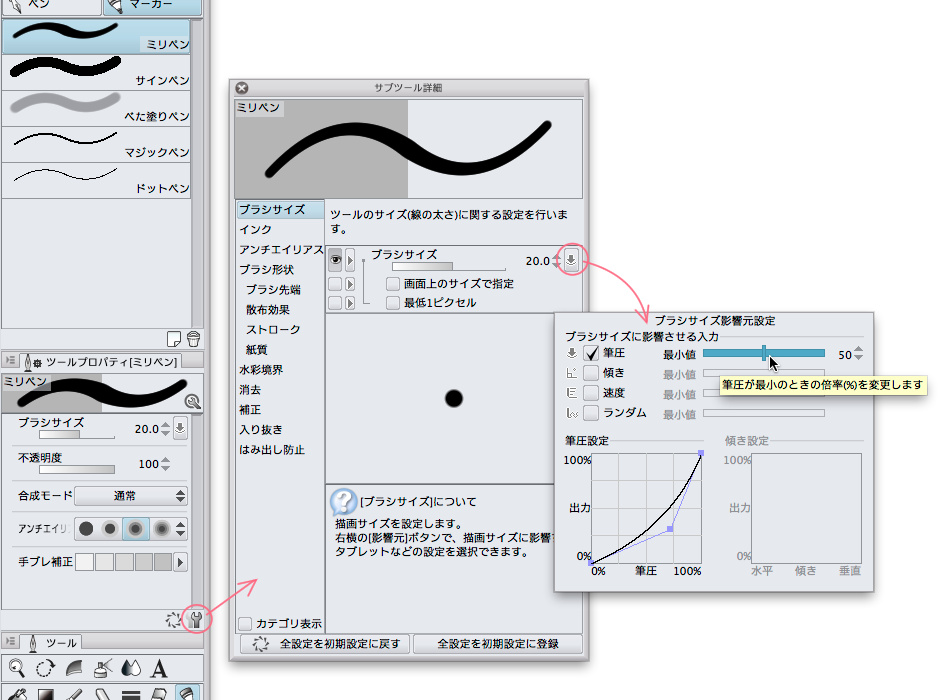 ・該当のペンツールを選択後、[ウィンドウ]メニュー→[サブツール詳細]を開き、