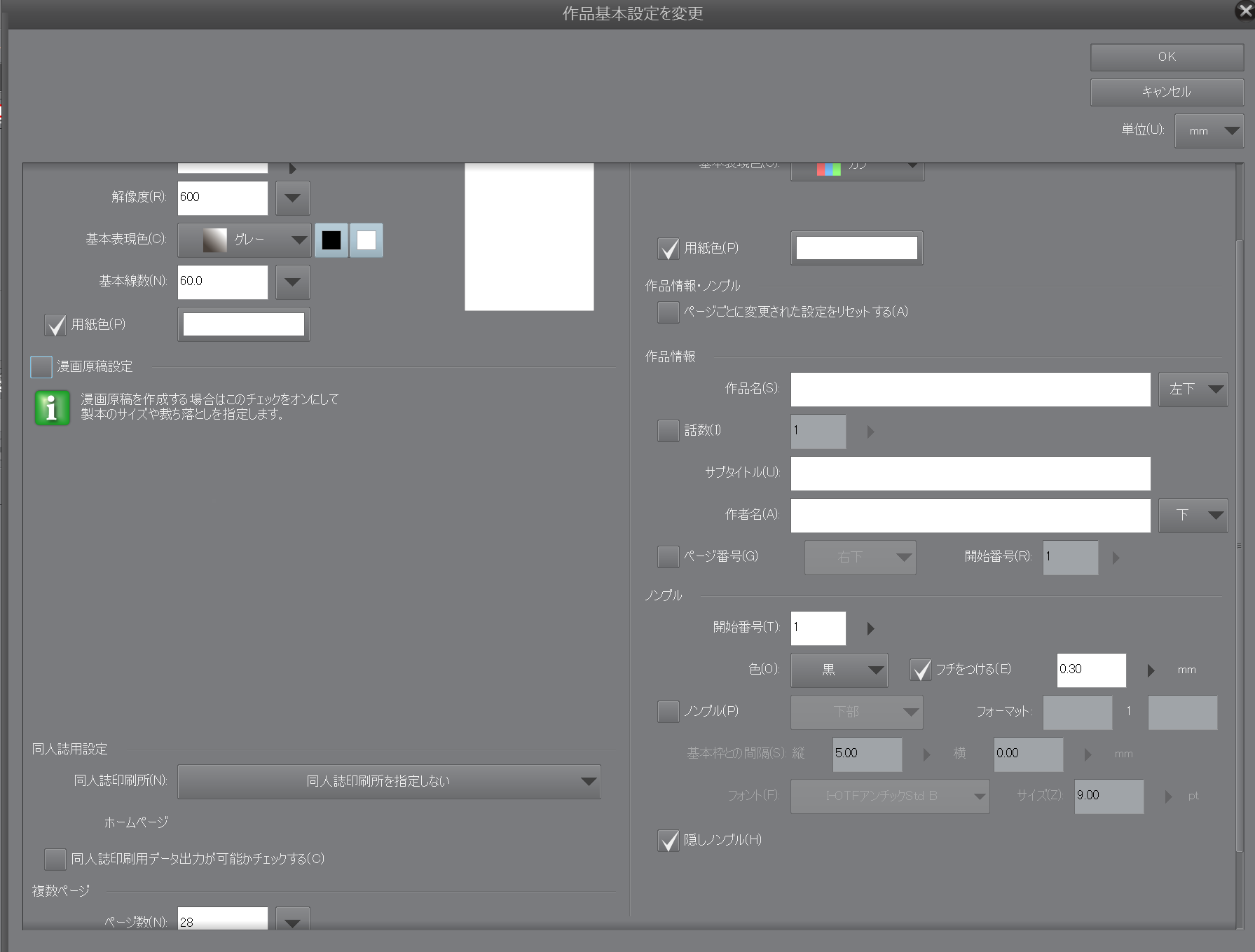・[編集]メニュー→[作品基本設定を変更]の画面