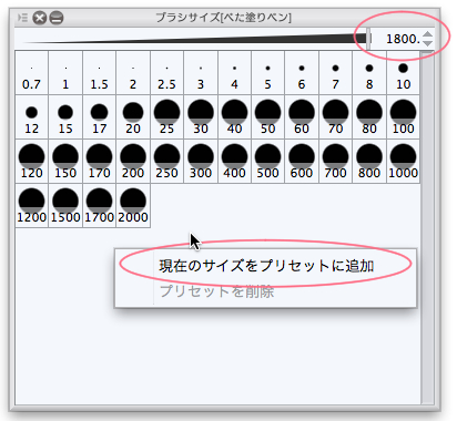 ブラシサイズパレットで必要ないサイズのアイコンを右クリックして