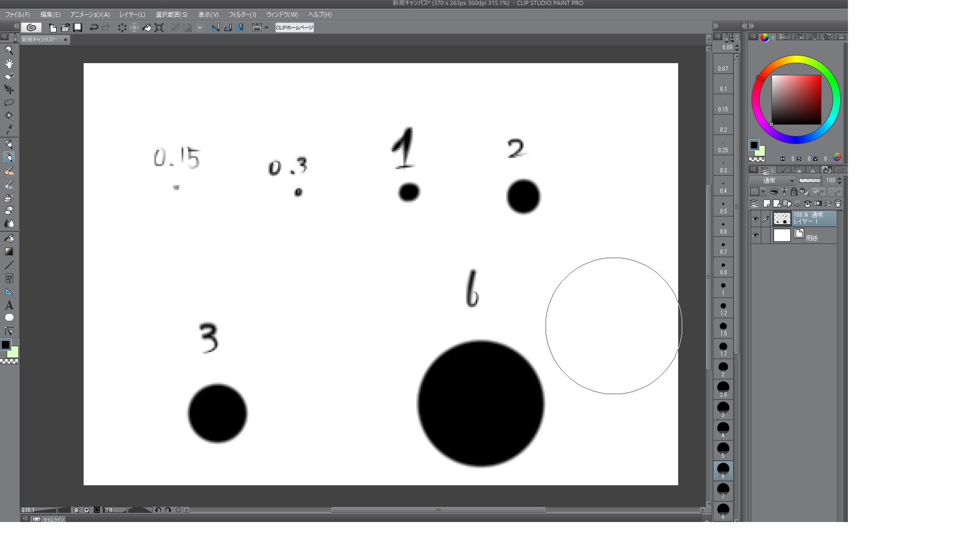 アンチエイリアスのガザガザ感が大きくなったのみでブラシサイズの大きさの比率はかわりませんでした。