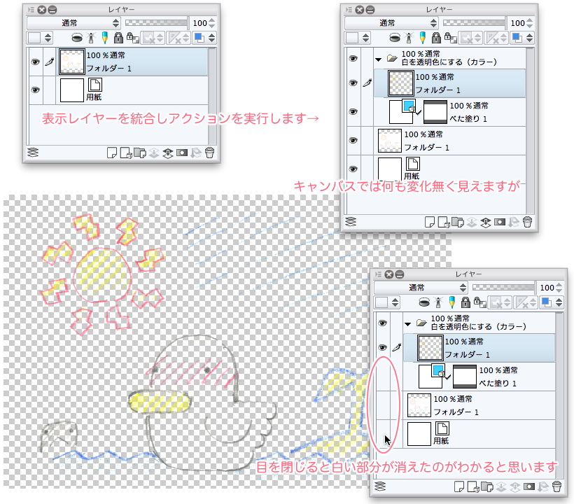 線を抜き出したいレイヤーを選んでこの「白を透明にする」を実行していただけると