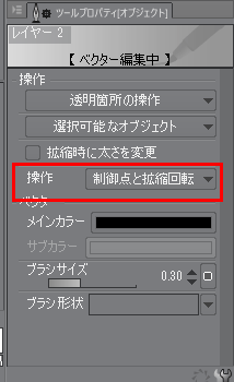 調べたところ、連続曲線を使用して書いた曲線を後から調整する場合、操作ツールの[制御点と拡縮回転]を使用すると書いてありました。 ですが、線画を書いているベクターレイヤーを選択していても、操作ツールのプロパティには[透明箇所の操作]と[選択可能なオブジェクト]しか表示されません。 サブツール詳細を見ても同じです。 どうしたら編集が出来るようになるのでしょうか。 よろしくお願いします。 ------------------------------------------------------------ ■バージョン: ※Windowsは、[ヘルプ]メニュー → [バージョン情報]で確認できます。 ※MacOSXは、[CLIP STUDIO PAINT]メニュー → [バージョン情報]で確認できます。 ■グレード DEBUT( ) comico( ) PRO( ) EX( ◯ ) ■OS Windows XP( ) Windows Vista( ) Windows 7 ( ◯ ) Windows 8( ) Windows 8.1( ) Windows 10( ) MacOS X 10.5( ) MacOS X 10.6( ) MacOS X 10.7( ) MacOS X 10.8( ) MacOS X 10.9( ) MacOS X 10.10( ) MacOS X 10.11( ) mac OS 10.12( ) その他( ) ------------------------------------------------------------ |