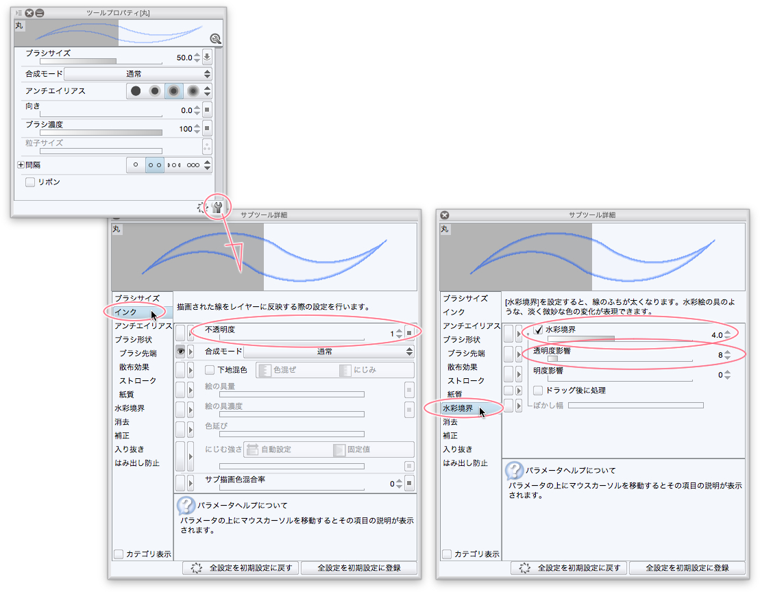 サブツール詳細のカテゴリ「水彩境界」の「水彩境界」にチェック、数値を「4」に