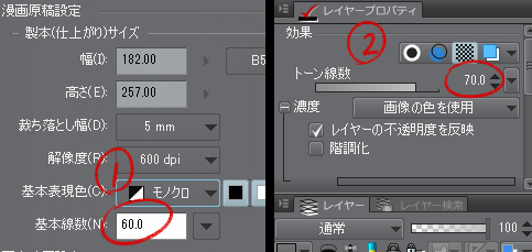 印刷設定にて表現色を「モノクロ2階調(トーン化)」、トーン線数を「出力倍率に依存する」にした場合 出力倍率が100%(実寸)だとグレスケレイヤーの線数はいくつになるのでしょうか。 ①ドキュメントを新規作成したときに指定した「基本線数」で全て出力されるのでしょうか。 ②それともグレスケレイヤーのレイヤープロパティ「トーン」を押したときに表示される 「トーン線数」でレイヤー毎に異なった値で出力されるのでしょうか。 どこの設定値を基準にしているか分からないためご教授願います。 ![]() ------------------------------------------------------------ ■バージョン: ※Windowsは、[ヘルプ]メニュー → [バージョン情報]で確認できます。 ※MacOSXは、[CLIP STUDIO PAINT]メニュー → [バージョン情報]で確認できます。 ■グレード DEBUT( ) comico( ) PRO( ) EX( ○ ) ■OS Windows XP( ) Windows Vista( ) Windows 7 ( ○ ) Windows 8( ) Windows 8.1( ) Windows 10( ) MacOS X 10.5( ) MacOS X 10.6( ) MacOS X 10.7( ) MacOS X 10.8( ) MacOS X 10.9( ) MacOS X 10.10( ) MacOS X 10.11( ) mac OS 10.12( ) その他( ) ------------------------------------------------------------ |