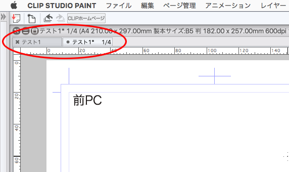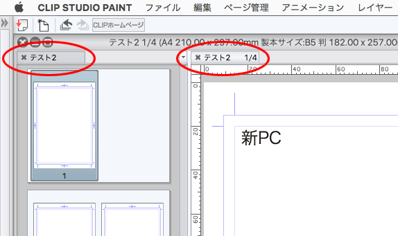 この時点で単ページのキャンバスのみの画面表示になり、全ページサムネイルのキャンバスタブと開いた単ページのタブが左上に並んだ状態になっておりました。