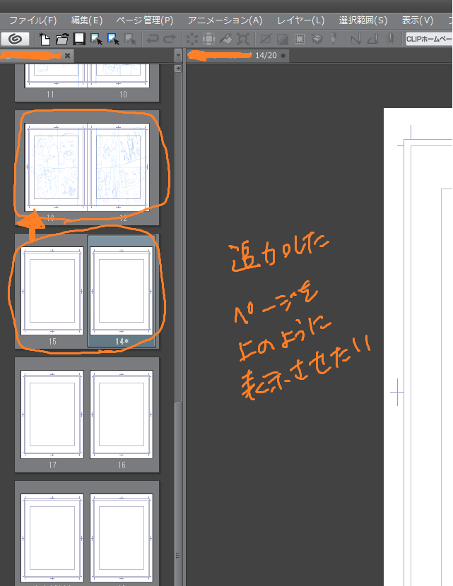 [ページ管理]メニューより[見開きに変更]を選択し、14ページと