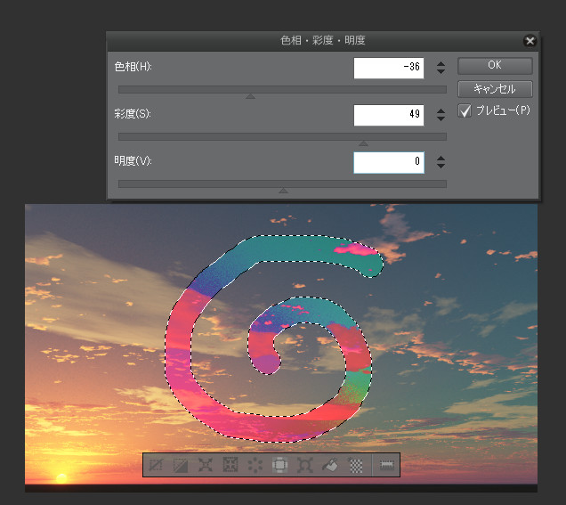 「編集」→「色調補正」→「色相・彩度・明度」をクリックすることで