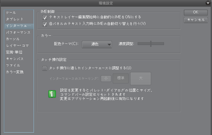 ・[ファイル]メニュー→[環境設定]→[タブレット]のスクリーンショットを