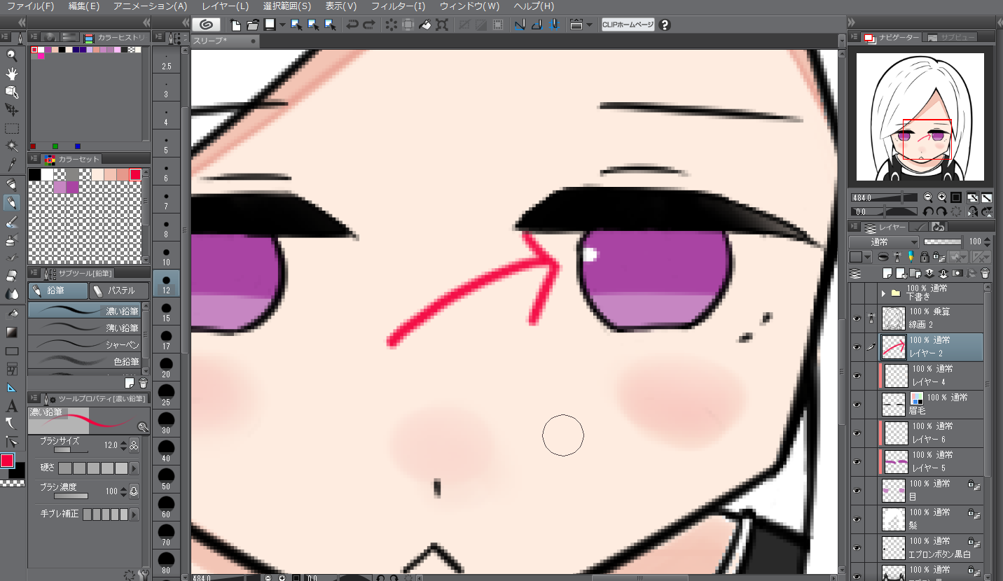 目にハイライトを入れたいのですが、白色のエアブラシで塗ろうとしたところ線画の黒い線が残ってしまいました。 どのように操作したら線画を消して塗ることができますか?お願いします。 ![]() ------------------------------------------------------------ ■バージョン: ※Windowsは、[ヘルプ]メニュー → [バージョン情報]で確認できます。 ※MacOSXは、[CLIP STUDIO PAINT]メニュー → [バージョン情報]で確認できます。 ■グレード DEBUT( ) comico( ) PRO( ○ ) EX( ) ■OS Windows XP( ) Windows Vista( ) Windows 7 ( ○ ) Windows 8( ) Windows 8.1( ) Windows 10( ) MacOS X 10.5( ) MacOS X 10.6( ) MacOS X 10.7( ) MacOS X 10.8( ) MacOS X 10.9( ) MacOS X 10.10( ) MacOS X 10.11( ) mac OS 10.12( ) その他( ) ------------------------------------------------------------ |
