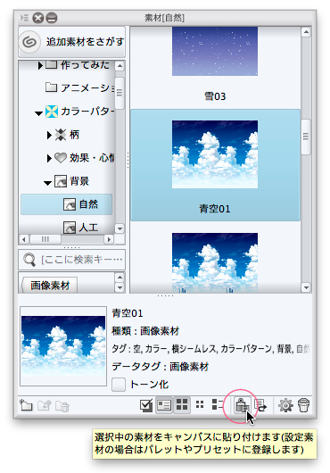 この素材を使うときはCLIP STUDIO PAINTの素材パレットで目的の素材を選択した後