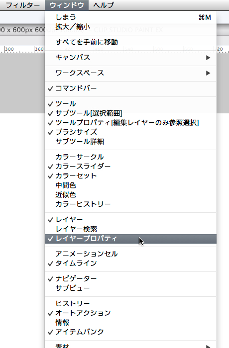 メニューのウィンドウから「レイヤープロパティ」を選びます