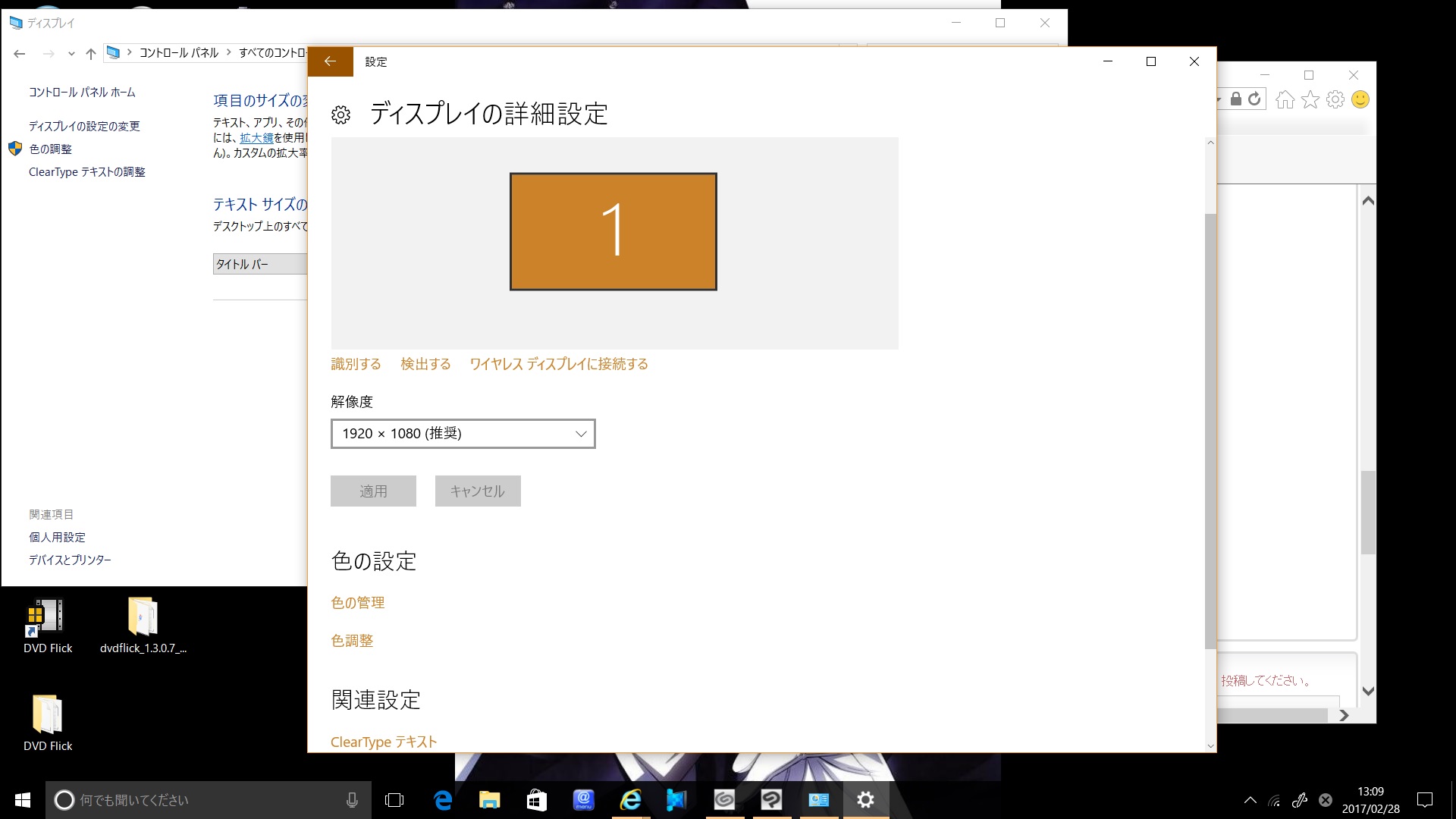 ・[コントロールパネル]を開き、[ディスプレイ]設定の[画面の解像度]を開き、