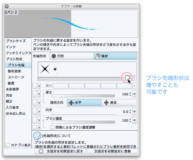 素材パレットから先端の素材を削除するとブラシ本体はサブツールに残りますが