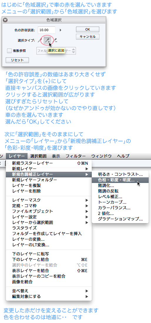 はじめまして。 ある画像の一部の色だけを描画なしで見本となる色に近付けたいです。 (例:赤色の自動車を見本に近い青色にする。) 現状は、 赤色部分だけを選択範囲で囲う。 ↓ [編集]→[色調補正]→[色相・明度・彩度]から調整。 ↓ 調整後の色と見本の色をスポイトなどを使い見比べる。 このように感覚で作業しており、なかなか思うように見本に近づけることができません。 何か良い方法や目安とすべきものがありましたら教えていただけますか。 よろしくお願いいたします。 ------------------------------------------------------------ ■バージョン: ※Windowsは、[ヘルプ]メニュー → [バージョン情報]で確認できます。 ※MacOSXは、[CLIP STUDIO PAINT]メニュー → [バージョン情報]で確認できます。 ■グレード DEBUT( ) comico( ) PRO( ○ ) EX( ) ■OS Windows XP( ) Windows Vista( ) Windows 7 ( ) Windows 8( ) Windows 8.1( ) Windows 10( ) MacOS X 10.5( ) MacOS X 10.6( ) MacOS X 10.7( ) MacOS X 10.8( ) MacOS X 10.9( ) MacOS X 10.10( ) MacOS X 10.11( ○ ) mac OS 10.12( ) その他( ) ------------------------------------------------------------ |