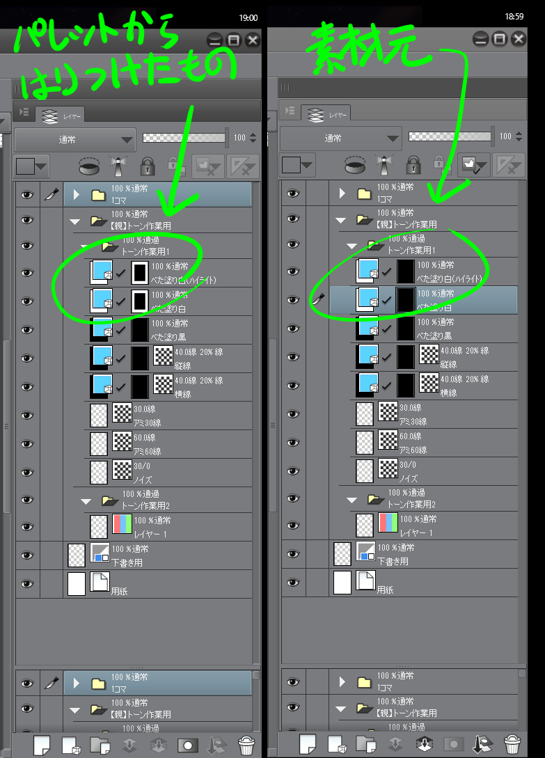 コマ枠レイヤー含む複数のレイヤーセットを素材化して使っていますが、素材パレットからドロップして適用した際 特定のレイヤーのみコマ枠と同じ形にレイヤーマスクが変更されてしまいます。 (複数のべた塗りレイヤーを使っていますが、こうなるレイヤーは画像の2枚だけです) 過去ログを参照した所範囲選択をしながら作成したり貼り付けたりすると、その形のマスクがかかるそうですが 当方は作成時も貼り付け時も特に範囲選択操作をしておりません。 以前から使っているレイヤーセットの素材なのですが、最近こうなるようになった気がします。 仕様の変更があったのでしょうか? ![]() ------------------------------------------------------------ ■バージョン: ※Windowsは、[ヘルプ]メニュー → [バージョン情報]で確認できます。 ※MacOSXは、[CLIP STUDIO PAINT]メニュー → [バージョン情報]で確認できます。 ■グレード DEBUT( ) comico( ) PRO( ) EX( ○ ) ■OS Windows XP( ) Windows Vista( ) Windows 7 ( ) Windows 8( ) Windows 8.1( ) Windows 10( ○ ) MacOS X 10.5( ) MacOS X 10.6( ) MacOS X 10.7( ) MacOS X 10.8( ) MacOS X 10.9( ) MacOS X 10.10( ) MacOS X 10.11( ) mac OS 10.12( ) その他( ) ------------------------------------------------------------ |