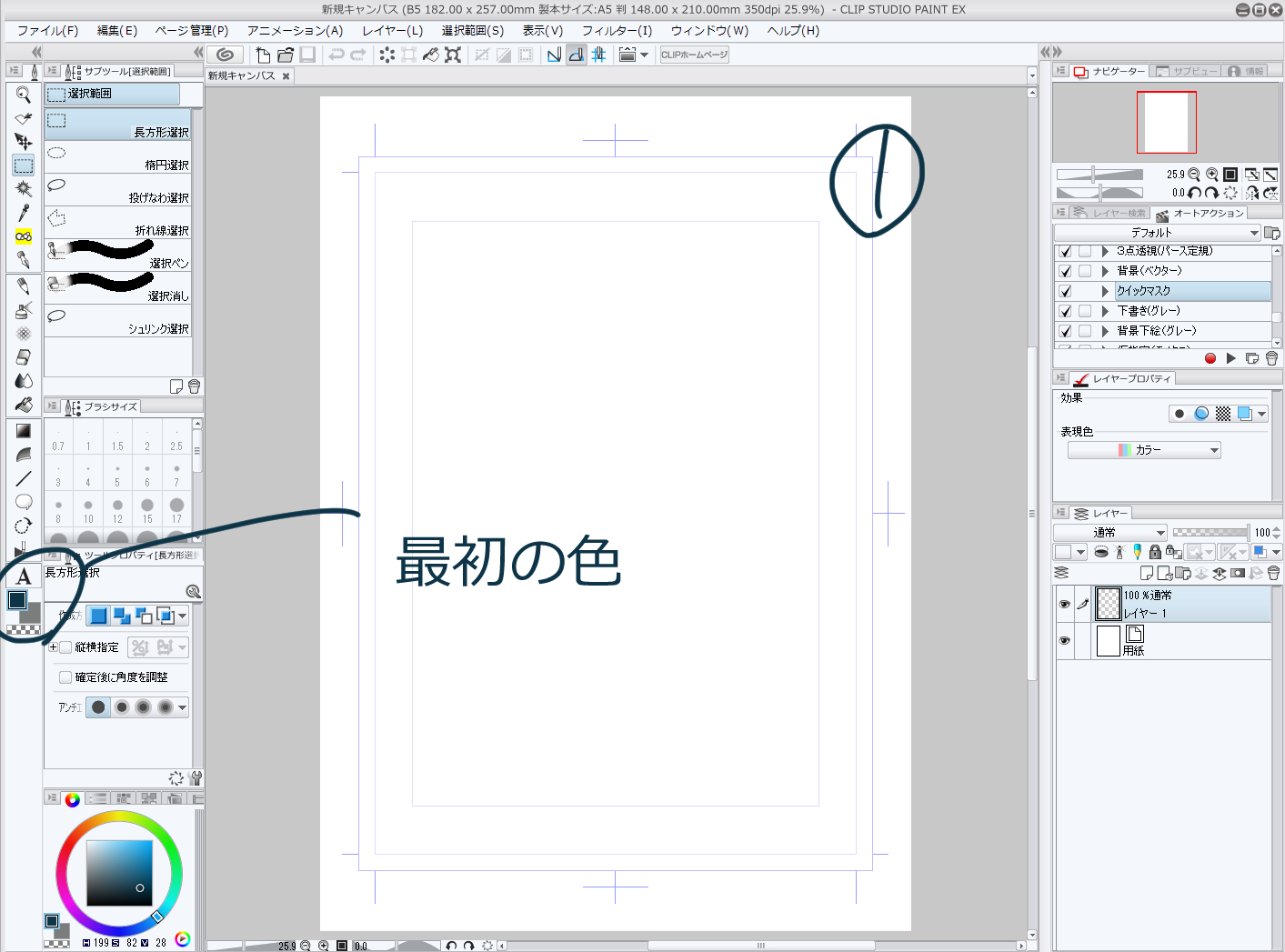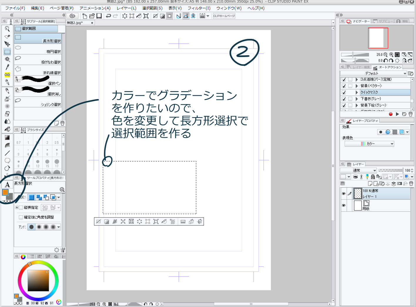 いつもお世話になっております。 ご相談したい事があり投稿いたしました。 ○カラー作画にクイックマスクを使うのですが、 選択範囲を適用するたびにツールのメインカラーが以前使った?色に 自動的に変更されてしまいます…。 改善方法がありましたらお知らせ頂けると助かります。 ○レイヤーを移動する時に 誤ってフォルダに入れ込んでしまう事が多々あります…。 レイヤーが入れられないようフォルダにロックをかける事は できるのでしょうか? お手数をおかけしますが、 どうぞよろしくお願いいたします。 ------------------------------------------------------------ ■バージョン: ※Windowsは、[ヘルプ]メニュー → [バージョン情報]で確認できます。 ※MacOSXは、[CLIP STUDIO PAINT]メニュー → [バージョン情報]で確認できます。 ■グレード DEBUT( ) comico( ) PRO( ) EX( ○ ) ■OS Windows XP( ) Windows Vista( ) Windows 7 ( ○ ) Windows 8( ) Windows 8.1( ) Windows 10( ) MacOS X 10.5( ) MacOS X 10.6( ) MacOS X 10.7( ) MacOS X 10.8( ) MacOS X 10.9( ) MacOS X 10.10( ) MacOS X 10.11( ) mac OS 10.12( ) その他( ) ------------------------------------------------------------ |