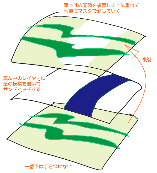 植物は、後ろにある「白壁」と同一のレイヤーに描かれており、