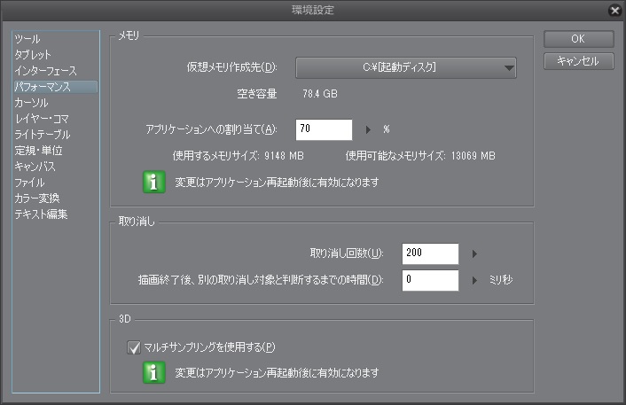 1か月ほど前から突然、起動に3~5分程度の時間を要するようになり、 やっと起動したと思ったら保存完了までにも同程度の時間がかかるようになりました。 それ以前は全くストレスなく利用できていたのでパソコンのスペックに問題はないように思えるのですがいかがでしょうか。 ちなみに、パソコンの空き容量も充分あります。 ちなみに基本スペックは以下の通りです。 OS:windows 7 pro 64bit CPU:Corei7-3770 GPU:GTX660 メモリ:16GB ------------------------------------------------------------ ■バージョン: ※Windowsは、[ヘルプ]メニュー → [バージョン情報]で確認できます。 ※MacOSXは、[CLIP STUDIO PAINT]メニュー → [バージョン情報]で確認できます。 ■グレード DEBUT( ) comico( ) PRO( ) EX( 〇 ) ■OS Windows XP( ) Windows Vista( ) Windows 7 ( 〇 ) Windows 8( ) Windows 8.1( ) Windows 10( ) MacOS X 10.5( ) MacOS X 10.6( ) MacOS X 10.7( ) MacOS X 10.8( ) MacOS X 10.9( ) MacOS X 10.10( ) MacOS X 10.11( ) mac OS 10.12( ) その他( ) ------------------------------------------------------------ |