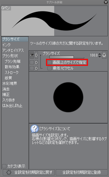 キャンバスをズームイン/ズームアウトした際、ブラシサイズが変わってしまいます。 拡大して描く際に、毎回ブラシサイズを手作業で調整しないといけないので困っています。 改善方法の見当がつかず投稿させて頂きました。 お手数ですが、ご教授いただけないでしょうか。 よろしくお願いいたします。 ------------------------------------------------------------ ■バージョン:1.6.4 ※Windowsは、[ヘルプ]メニュー → [バージョン情報]で確認できます。 ※MacOSXは、[CLIP STUDIO PAINT]メニュー → [バージョン情報]で確認できます。 ■グレード DEBUT( ) comico( ) PRO( ) EX( ○ ) ■OS Windows XP( ) Windows Vista( ) Windows 7 ( ) Windows 8( ) Windows 8.1( ) Windows 10( ) MacOS X 10.5( ) MacOS X 10.6( ) MacOS X 10.7( ) MacOS X 10.8( ) MacOS X 10.9( ) MacOS X 10.10( ) MacOS X 10.11( ) mac OS 10.12( ○ ) その他( ) ------------------------------------------------------------ |
