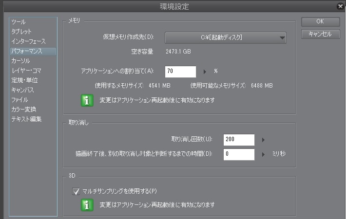 ・[ファイル]メニュー→[環境設定]を開き、[パフォーマンス]を