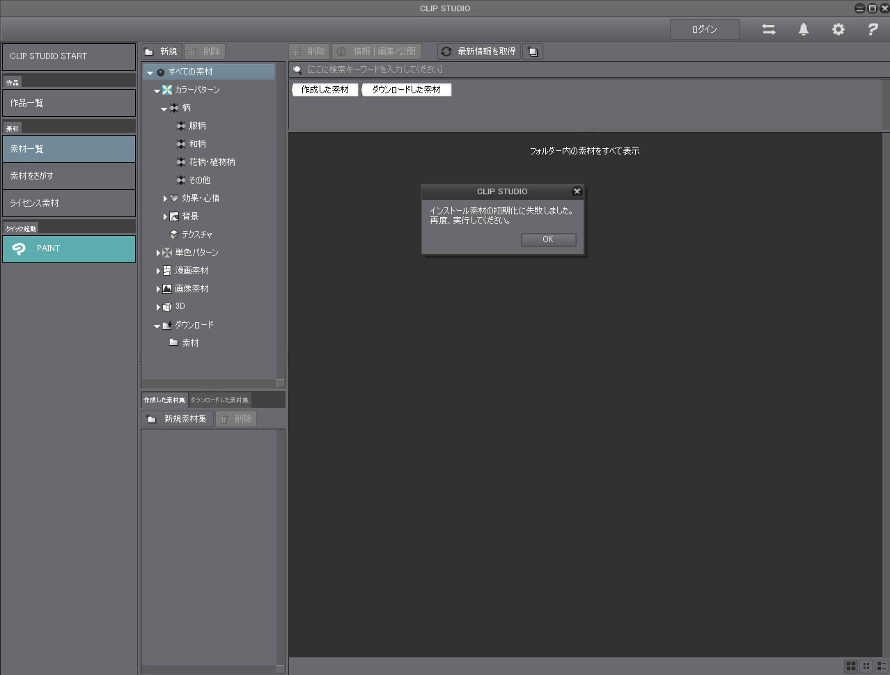 CLIP STUDIO PAINT PROの体験版をインストールし、下記ページの素材データ(786MB)をダウンロードしました。 http://www.clip-studio.com/clip_site/rental/rental_download/sprental/materialマニュアルに従ってCLIP STUDIOの右上の歯車マークからzipファイルを解凍したフォルダを指定しインストールしましたが インストールした素材がどこにも反映されていないように見えます。 機能制限状態では使えないのかと思い、30日の試用登録をしてみましたが同じ状態でした。 (ただし素材アンインストールを起動するとCLIP STUDIO PAINT素材01--CLIP STUDIO CS 1.1.1というものがアンインストール対象として表示されています) CLIP STUDIOの左のメニューにある素材一覧のすべての素材配下にあるカラーパターンや3Dの下層を展開して クリックすると左側に何かが表示されるものと思っていたのですが違うのでしょうか? |