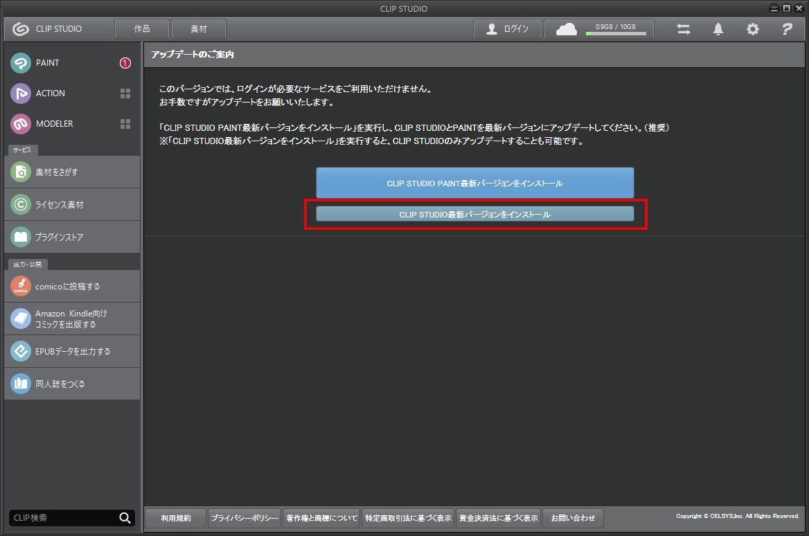 赤枠部分をクリックして、CLIP STUDIOのみのアップデートを行ってください。