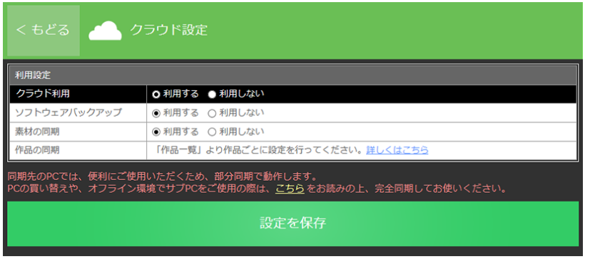 また、ソフトウェアバックアップや素材の同期などについては、自動で行われます。