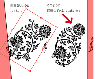 手順が悪いのか、キャラクター素材として適用したワンポイントマークを変形や回転、“赤いガイド線”が出ているときは、変形、回転しているのですが、[OK]後、元に戻り、マスク部分?でしょうか? その部分だけが変形したようでワンポイントマークが欠けてしまいます。
