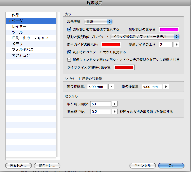 ・[環境設定]画面で[ページ]項目を展開した時に[カーソル]が表示され、そこで詳細な設定