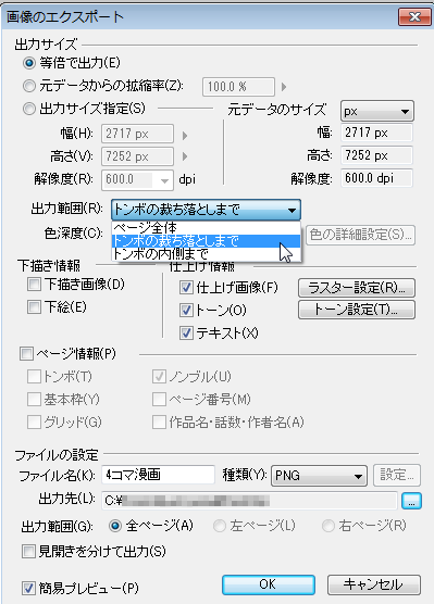 5.「出力範囲」を[トンボの裁ち落としまで]を選択し任意のファイル名と保存場所を指定して[OK]ボタンをクリックします。