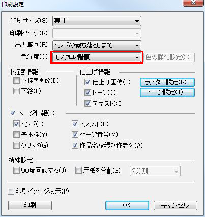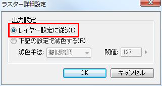[印刷設定]ダイアログの内容と、[ラスター設定]をクリックして