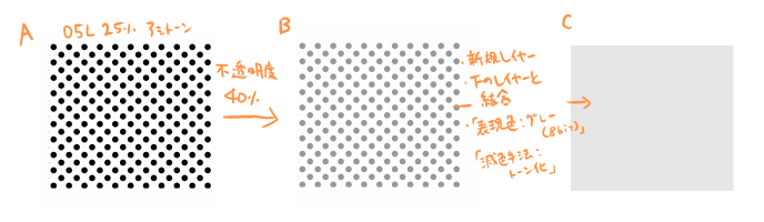 トーンレイヤーの「不透明度」を下げた状態と同じ見た目で印刷できるような