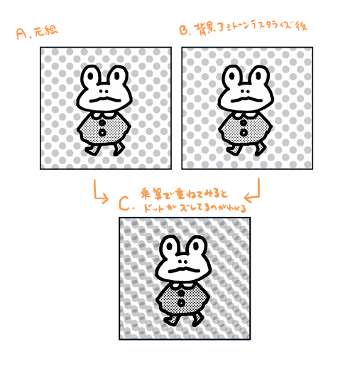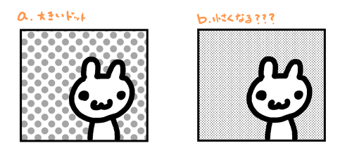 講座の手順でトーン化してみると表示がb.のように細かい網点になってしまい(コマフォルダ使用してます)、
