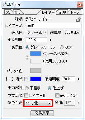 グレーで読み込んだ後にレイヤーのプロパティを開くと、[減色手法]が