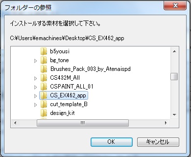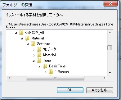3.[素材インストール]ダイアログが表示されますので、[フォルダ