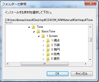 ComicStudioEX4.0をダウンロード購入しました。 トーン素材が欲しくて素材ダウンロードを行いzipの解凍をし、 解凍したフォルダを[素材インストール]時に指定しましたが、フォルダを見つけられずにいます。 それらしいフォルダを見つけて選択しても、この素材はComicstudioの素材ではないと出ます。 ![]() ![]() ![]() 宜しくお願いします