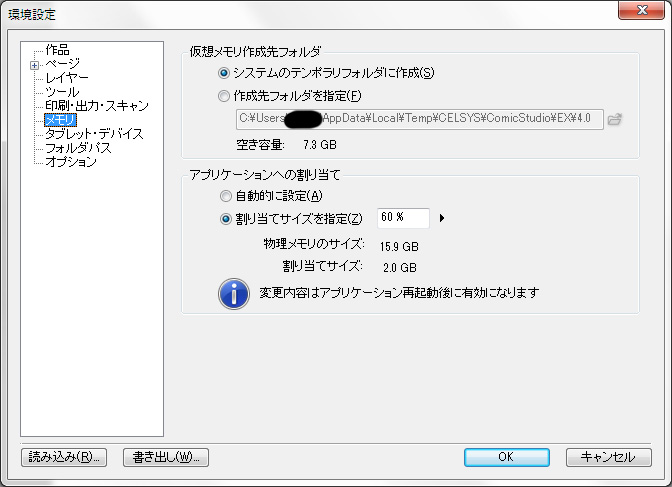 ・[ファイル]メニュー→[環境設定]を開き、[メモリ]を選択した状態で