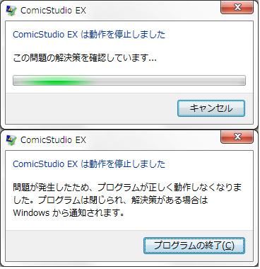 OS Win7(64bit) CPU Core i5-4570(3.20GHz) メモリ 16GB(MAX) グラ NVIDIA GeForce GT 640 Cドライブ Samsung SSD 840 EVO 120G ------------------------------------------------------------ ■ComicStudio ComicStudioEX( ○ ) ComicStudioPro( ) ComicStudioMini( ) ComicStudioDebut( ) バージョン:4.6.2 ※Windowsは、[ヘルプ]メニュー → [バージョン情報]で確認できます。 ※MacOSXは、[ComicStudio(各グレード)]メニュー → [バージョン情報]で確認できます。