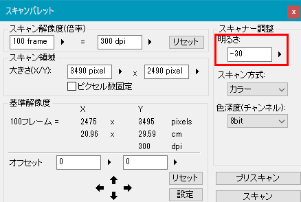 ●タップ穴を確実に検出させるには、スキャンパレットの[スキャナー調整/明るさ]をマイナス30前後にします。(←ここ◆ポイント)