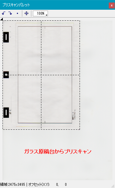 ●ガラス原稿台にプレビュー用の作画用紙を、操作する人から見てガラス面の奥側にタップ穴位置を配置し、画像面を下向きでプリスキャンを実行します。