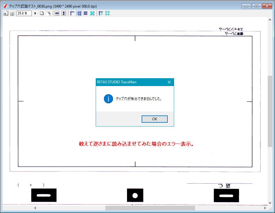 たまに[タップの穴が検出できませんでした。]と表示して取り込みを停止する場合がありますが[OK]を押せば、取り込み自体は続行します。