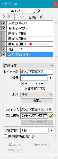 (説明画像のバッチ処理で[左回転]はプリスキャンパレットを縦に表示しているから)