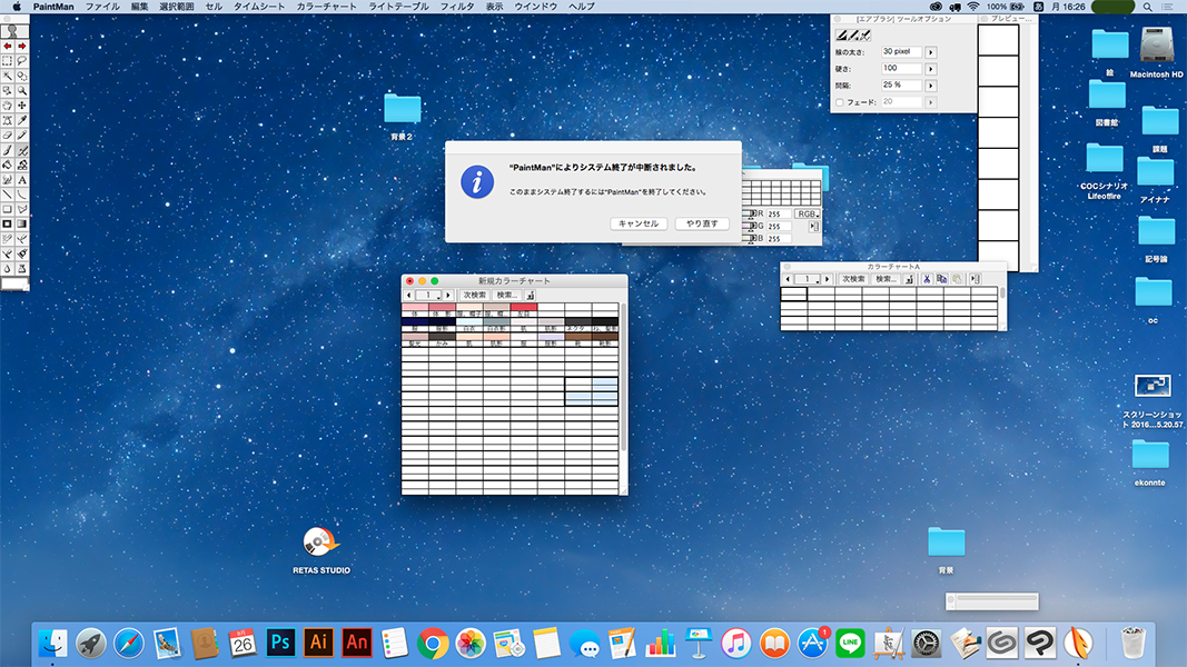 昨日レタススタジオを購入し早速使っていたのですが、PaintManでカラーチャートを作っていると突然クリックしても動かなくなるました。 メニューも何も反応しないので終わらせることもできません。 この場合ソフトをアンインストールしたほうがいいのでしょうか。また今後同じようなことが起こった場合 どのように対処すればいいのでしょうか。 ------------------------------------------------------------ ■RETAS STUDIO CORE RETAS( ) PAINT MAN( ○ ) STYLOS( ) TRACE MAN( ) バージョン: ※Windowsは、[ヘルプ]メニュー → [バージョン情報]で確認できます。 ※MacOSXは、[アプリケーション名]メニュー → [バージョン情報]で確認できます。 ■OS Windows XP( ) Windows Vista( ) Windows 7 ( ) Windows 8( ) Windows 8.1( ) Windows 10( ) MacOS X 10.5( ) MacOS X 10.6( ) MacOS X 10.7( ) MacOS X 10.8( ) MacOS X 10.9( ) MacOS X 10.10( ○ ) MacOS X 10.11( ) mac OS 10.12( ) その他( ) ------------------------------------------------------------ |