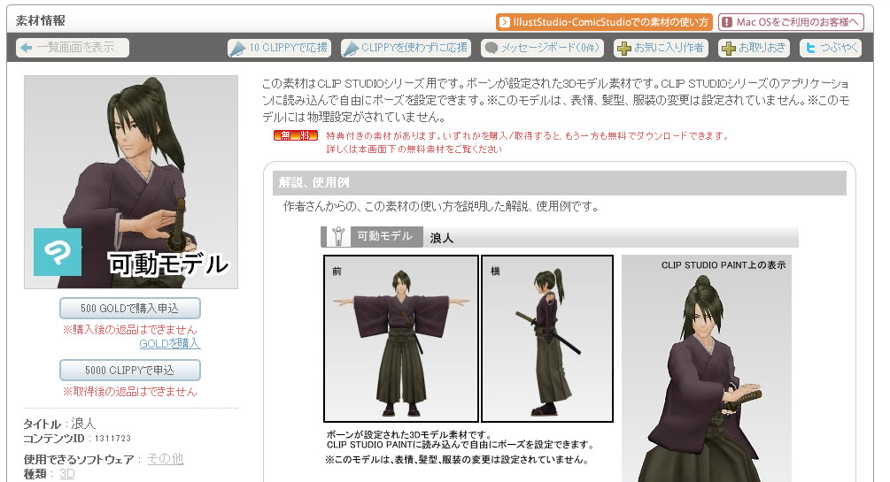 なお、POSE STUDIO用の可動モデルは、こちらになり、すでにCLIP STUDIOの可動モデルをダウン