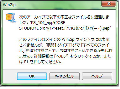 PS_104_appをダンロードし、解凍する際には以下のようなエラーが出ます。 このようなエラーは三回連続出ます。違うファイルみたいです。 ![]() 一応そのまま解凍もできますが、インストールする際にはすでに文字化け。 ![]() ![]() そのまま進むと、こういうエラーが出ます。 ![]() どんなエラーかわからないので、解決方法も見つけません。 一応文字化けたファイル名を全部数字に直してみましたが、同じようなエラーが繰り返します。 ダンロードも二回しましたが、解凍用のソフトも違うものを試した。やっぱり文字化けです。 システム自体は日本語版window 7 Ultimateですから、なぜ文字化けか教えていただけませんか。 ------------------------------------------------------------ ■POSE STUDIO バージョン: ※[ヘルプ]メニュー→[バージョン情報]で確認できます。 ■OS Windows XP( ) Windows Vista( ) Windows 7 ( Ultimate 日本語版 ) Windows 8( ) その他( ) ■グラフィック(ビデオ)カード グラフィックカード: ※[ヘルプ]メニュー→[グラフィック性能チェック]の [グラフィックカード]項目で確認できます。 ------------------------------------------------------------ |